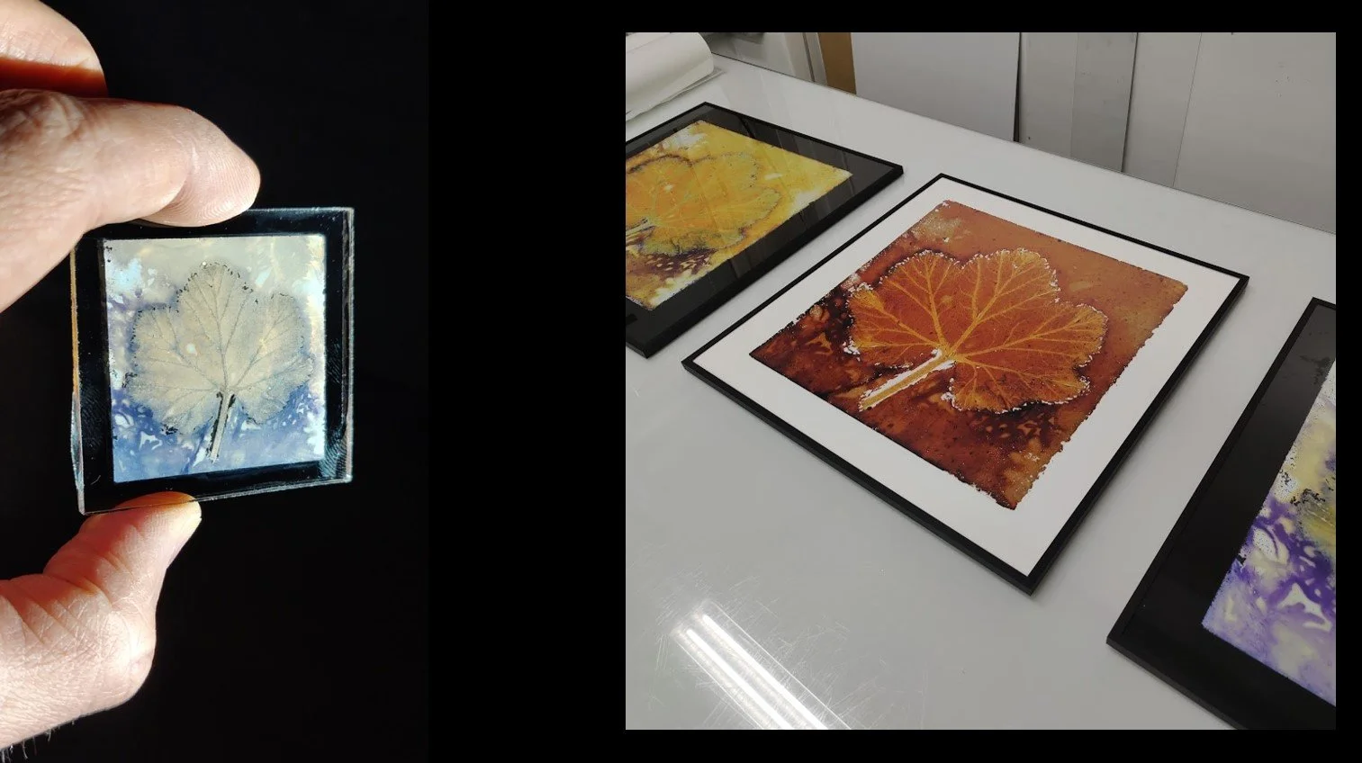 During the process, plants transfer their forms onto the nanoparticle layer at microscopic detail while their pigments stain the layer with natural dyes, forming a light-sensitive image that shifts in colour with the direction of illumination.